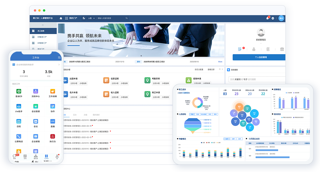 聚才林全新一代人事管理平台,PC、移动端自动适配,支持多终端入口,随时随地完成人事相关的所有工作,如微信、企微、APP、PC等