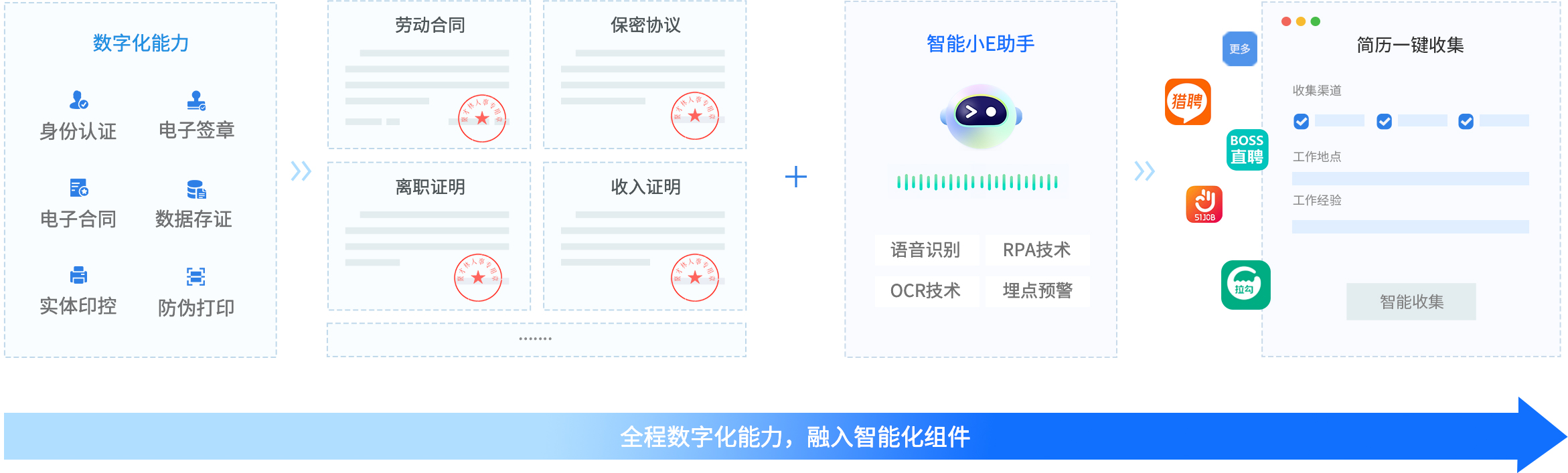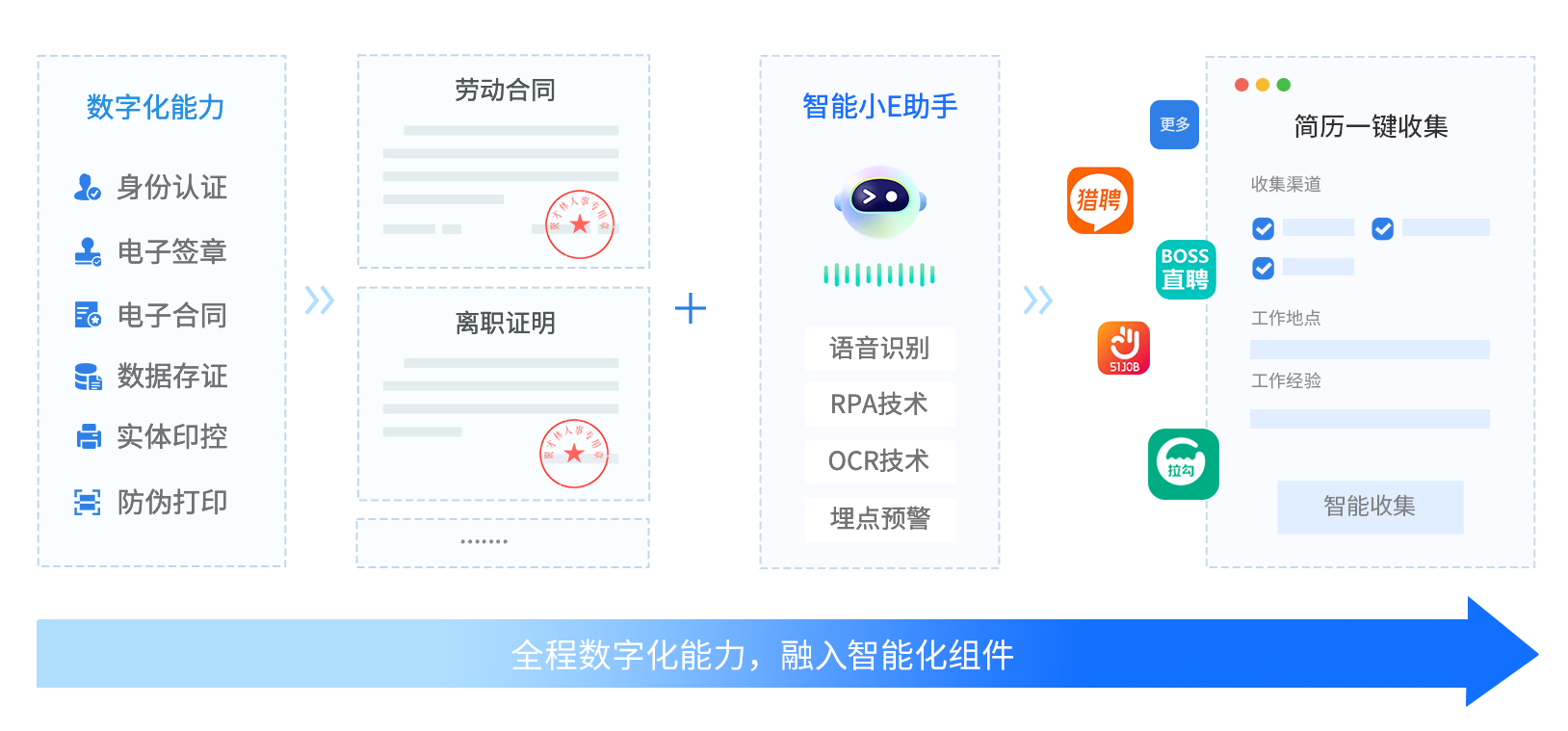 与业务融合,聚合人才真实情况;流程驱动、内外协同实现全面数智化、线上化;电子印章、智能应用全面提升效率降低风险;